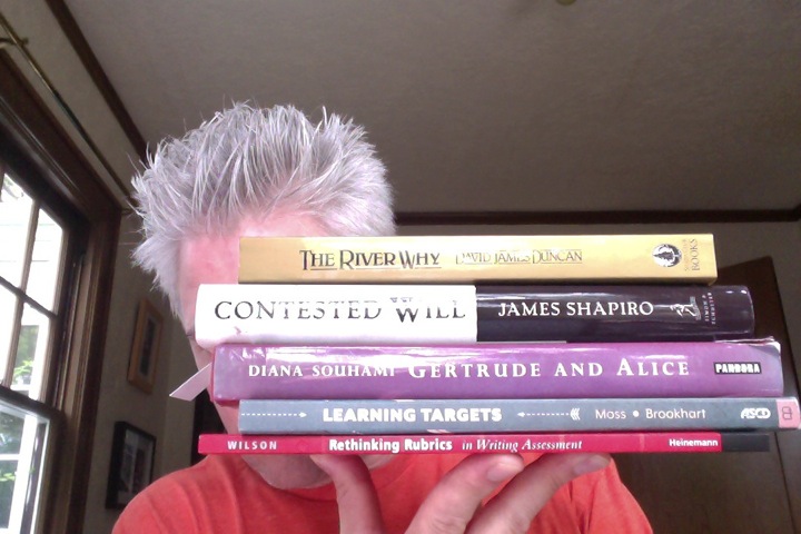 This was a happy accident. These books were pretty much in this order on my desktop, so, inspired by a recent book spine photo I saw in The Mighty Social Network, I decided to “craft” my first book spine poem. And I love the idea that the company suggested by the following titles would have not a few things to say about current fads in education reform. What would Gertrude Stein have to say about writing rubrics, for example. I also like how I worked my hair into the photo of the poem. So here goes a very slight thing.
