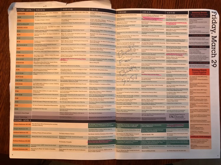 Oh my god, after three days of the kind of intensity that only a conference of thousands of creative writers under one roof could generate, I am spent. And yet, at 4:30 on Saturday, as I walk away from the Oregon Convention Center at the end of my last session at the Association for Writers and Writer’s Programs Conference, there are dozens of friends from across the country still somewhere lost in those throngs–closing up the book fair, attending or participating in the last afternoon lecture or panel, perhaps preparing for one more night of readings and some kind of culminating dance party–and I feel a deep sadness walking away without being able to say goodbye to each of them. What saves me from despair is that right before I get up to walk to my car, I get to see and chat briefly one more time with one of my first English College Professors ever, 36 some years ago now, in Writing 122, Tim Barnes. He looks great, happy, and he wants to publish one of my prose poems in the Friends of William Stafford Journal and Newsletter. And I am off, returning home for the last Saturday night and Sunday at the close of Spring Break.