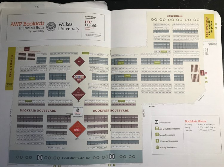 First of all, to give you a sense of the breadth and depth of each day’s offerings, here’s ONE page covering ONE day in the events schedule, followed by a map of the book fair, each tiny number representing a table or a booth run by a big small press, a small press, a tiny press, a writing conference, a writing getaway, or an MFA program in Creative Writing. It would be possible to spend 3 days in the book fair alone and not exhaust the possibilities. But as you can see looking at my copy of the schedule, I allowed myself only about an hour and a half each day to hang out at the book fair.