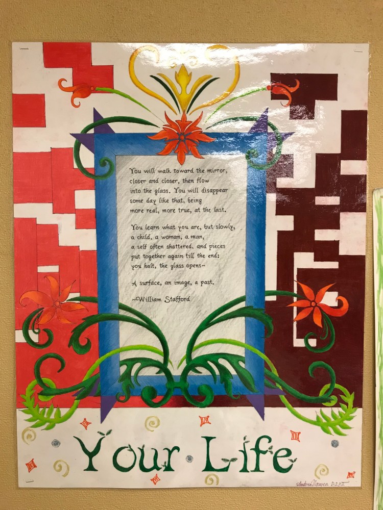 God, look at all of these books, file cabinets full of 30-years worth of handouts, lesson plans, readings, exams; check out all of this student generated art that I’ve never tossed, that quilt for The Color Purple, the portraits of the family from Geek Love, portraits of Virginia Woolf, the beautiful and huge broadside of William Stafford’s “Your Life”-the treasured haul of an English teacher’s career.