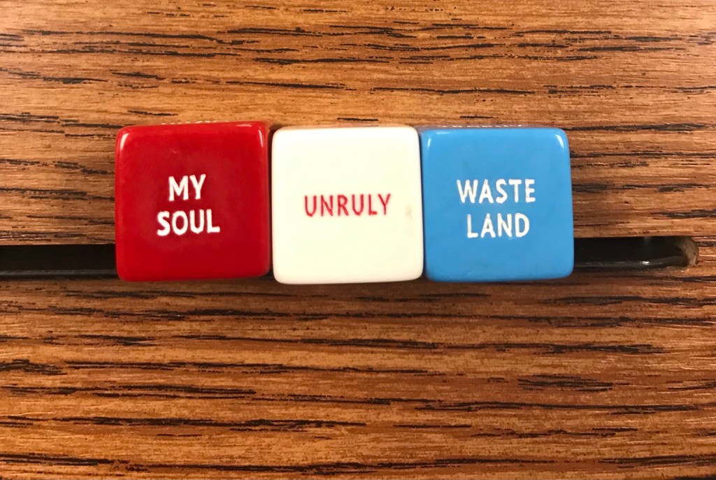 A Note on Today’s Poem: The assignment from Napowrimo today was to write an alter-ego poem. I passed on that particular prompt in favor of a poem from Taylor Mali’s metaphor dice, writing metaphor poems today along with my 10th grade students. I realize now, though, that this IS in fact an alter-ego poem, as it really does not represent in the least my normal outlook and attitude about things. As a person who aspires to be “soulful,” whatever that means, I would not likely describe my soul as being at all like a wasteland. But of course–there are always moments, right, and our alter-egos, rather than some kind of superhero or alternative and yet positive version of ourselves, tend to be rather shadowy, I’d say. Which brings me to the main reason for wanting to compose a little note here at the end.
