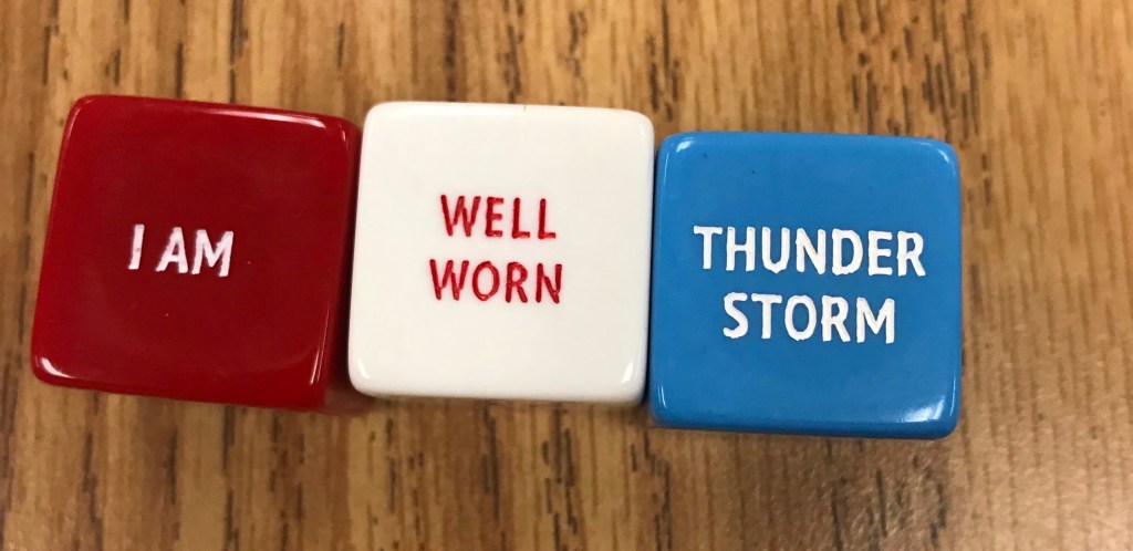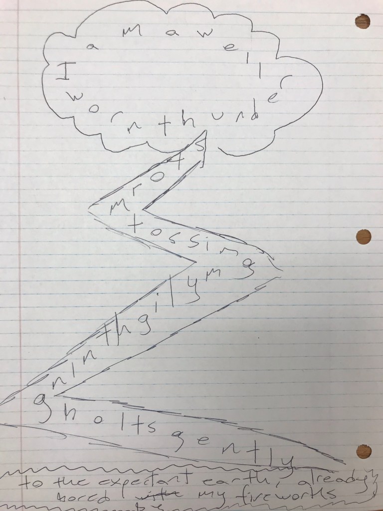 I intended this month to write a poem inspired by Taylor Mali’s metaphor dice that would be suitable for submission to The Golden Die Contest, the deadline for which is two days away. This isn’t it. This isn’t the one, neither is the earlier one I wrote this month. But I’ve been sitting on this roll for some time (I am, well worn, thunderstorm), and I was intrigued by today’s prompt at NaPoWriMo to write a concrete poem, a poem that has a shape that represents its subject matter. If you know anything about the word processing software that is part of the WordPress blog toolkit, you would know that it’s nigh impossible, outside of simply centering text, to manipulate words on the “page” into any kind of shape. So–the concrete poem, if I were to write one, would have to be done the old fashioned way–with pen and paper. I did not have time today to make it pretty–so here is the image of my sloppy composition on notebook paper, and below I will include the text of the poem, woefully, formatted in the way of a traditional poem–very unlike concrete.
