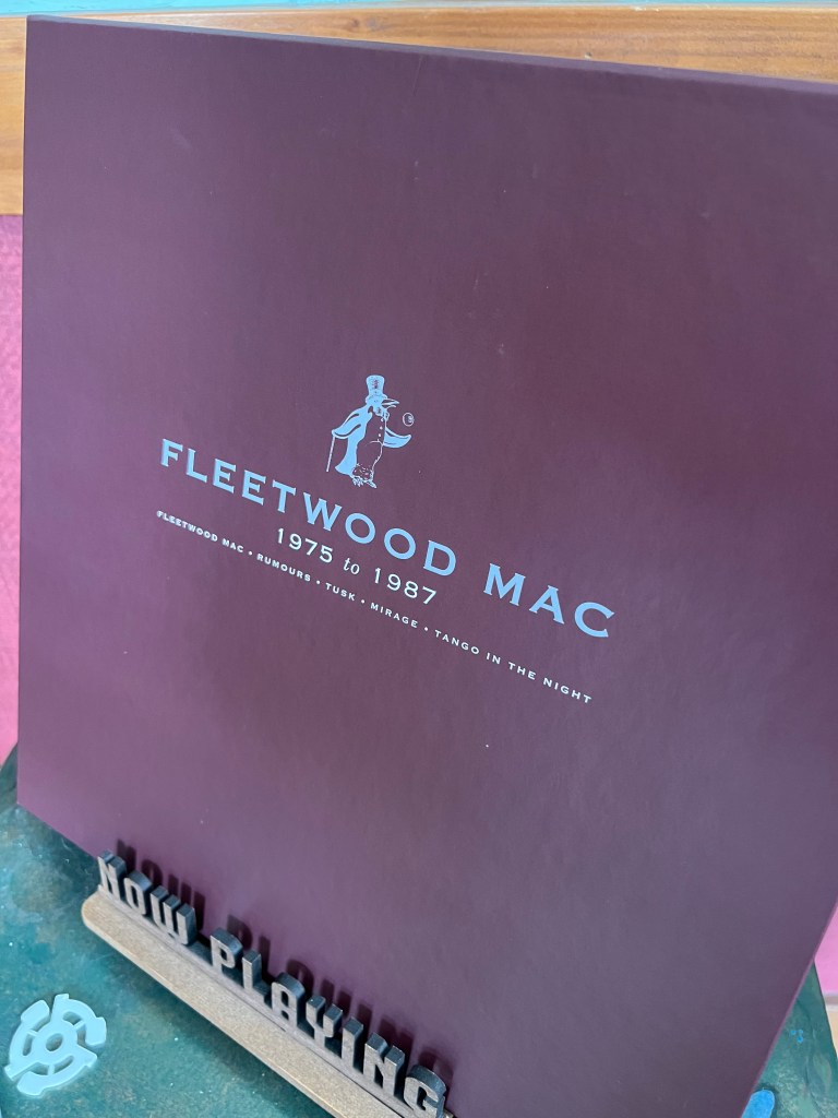Notes on the vinyl editions: Fleetwood Mac (1975-1987), Reprise Records, 2019, boxed reissues of the five Warner Brothers original releases on colored vinyl. Includes Fleetwood Mac on white, Rumours on clear, Tusk on gray, Mirage on translucent purple, and Tango in the Night on dark green vinyl.