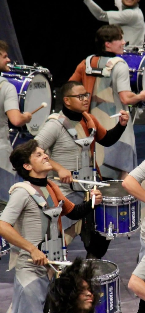 . . . converge on the University of Dayton Arena. They are from California, Washington, Oregon, Texas, Arizona Virginia, Kentucky, Georgia, Ohio, and nearly everywhere else, and they come in groups of anywhere between 30 and 60 young people with an entourage of adult coaches and technicians and parent volunteers in vans and buses and semi-trucks to put on a five to ten minute show they’ve been crafting and practicing and perfecting since August in front of thousands of indoor percussion fanatics, family and judges, once, if they’re not ready for prime time, twice, if they’re lucky, and three times, if they are among the best in the world, or at least, the best of those who made it to Dayton, an expensive, unwieldy, intensely complicated undertaking. We are here for the second year in a row to see our son play snare drum with Pulse Percussion. I watch again in awe from the spectator’s point of view, from the point of view of a proud parent. I’ve got skin in the game.