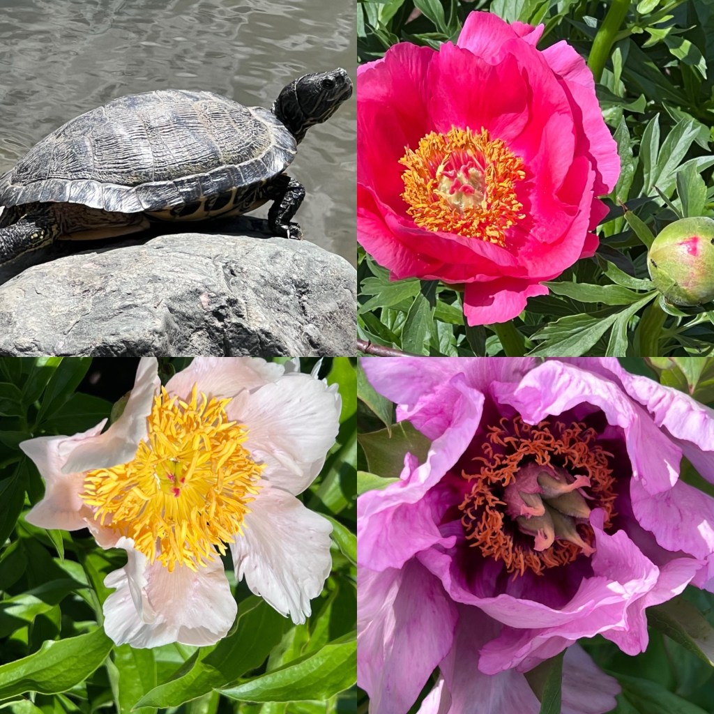 After three days in the Dayton arena listening to drum line after drum line in the Winter Guard International Indoor Percussion World Championship, we have time to kill before our flight home. We decide to visit a place completely void of drum lines and find ourselves at the Cox Arboretum MetroPark. That place was fresh out of drum lines. Instead, the show here featured miles of walking trails surrounded by trees, shrubs, irises, alliums, lilacs, ponds, a few geese, and turtles. There were some people around suspiciously preparing for some celebration or another, maybe a wedding, a little girl carried the top of a cake around, escorted by a couple of dressed up adults. Mostly, the park was quiet except for the traffic noise from a nearby invisible highway, and a helicopter flew over once. We walked about a mile and a half, cleansing the palate, lingering on the flowers, taking pictures of them, and taking pictures of the turtles, swimming, sunbathing on rocks, making no audible sound. Not one beat.